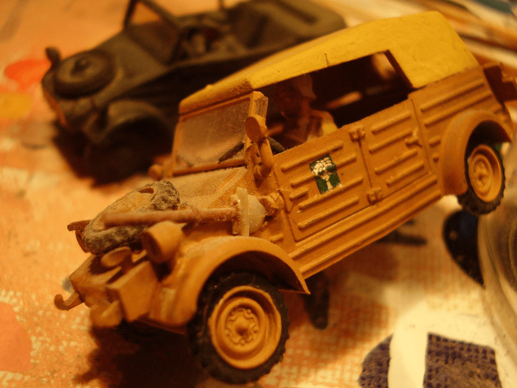 A Hasegawa 1/72 DAK Kubel Wagen with Airfix cousin in the background. Non-armoured vehicles are often referred to as Soft Skins. In the 1970s, they brought the Kubel Wagon back under the name ‘The Thing’…I saw one done up in Wehrmacht colours and markings, and in place of a unit symbol was a ‘baby-on-board’ symbol.